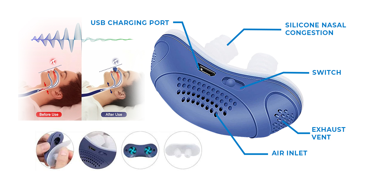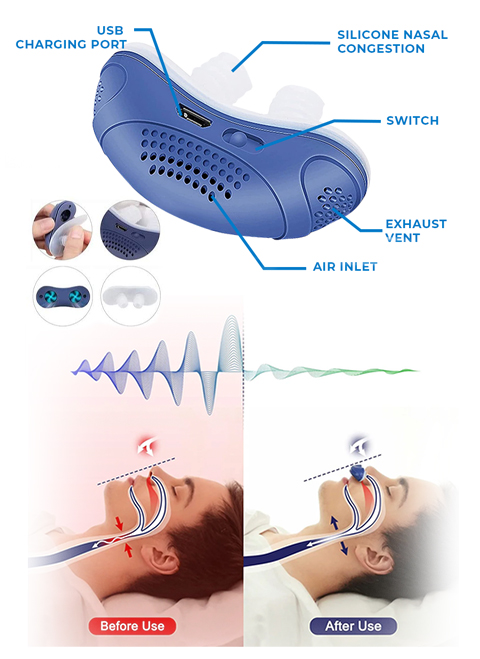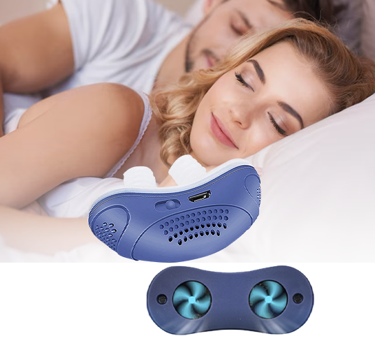 The anti-snoring device is designed with dual vortex air delivery, which expands the airway and provides smooth airflow. It makes breathing smoother and stops snoring efficiently. Keeps your breathing smooth at all times while sleeping, helps stop snoring, and corrects the habit of mouth-to-mouth breathing, thus further solving various health problems caused by snoring.